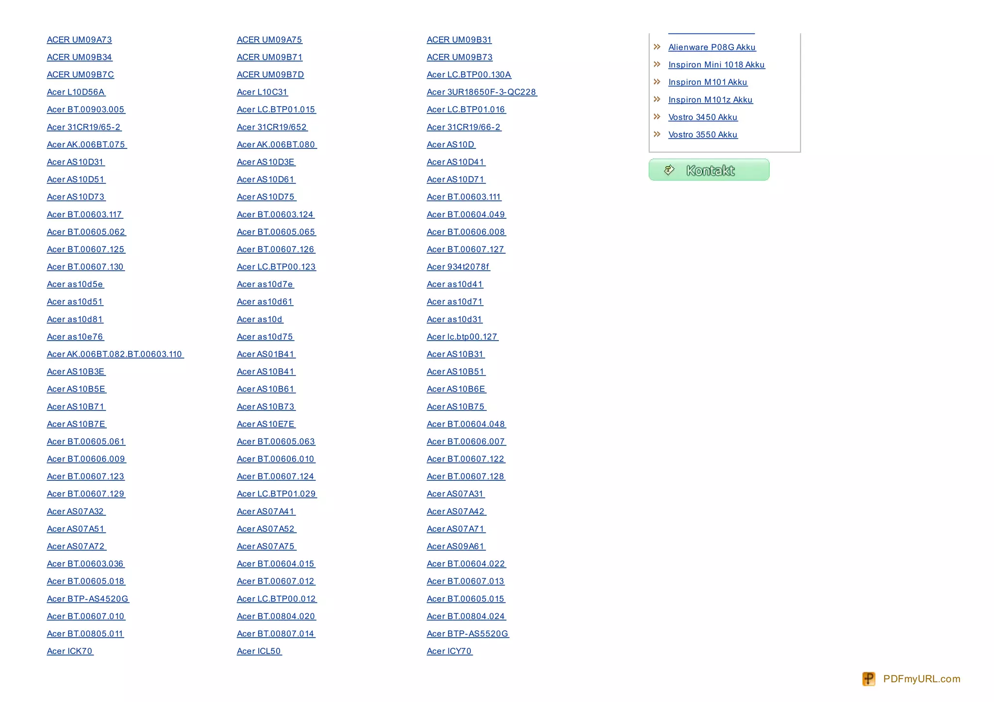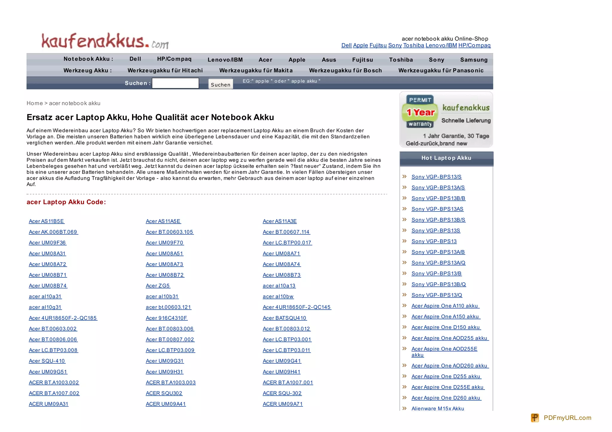 This document provides information about replacement laptop battery models for various Acer laptop models. It lists many specific Acer laptop battery codes and models that can be purchased for replacing a dead or weak laptop battery. The batteries are advertised as high quality replacements that offer long battery life at lower prices than original batteries.