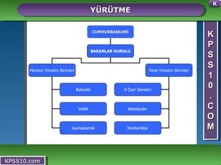 K P SS 1 0 . C O M YÜRÜTME KPSS10.com K CUMHURBAŞKANI BAKANLAR KURULU Merkezi Yönetim Birimleri Yerel Yönetim Birimleri Bakanlık Valilik Kaymakamlık İl Özel İdareleri Belediyeler Muhtarlıklar