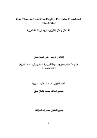 This document is a translated collection of 1001 English proverbs into Arabic. It includes the English proverbs translated to Arabic along with their meanings. The translator dedicates the book to his parents, siblings, wife, children and any Arabic readers interested in proverbs. It also includes references used in the translation process.