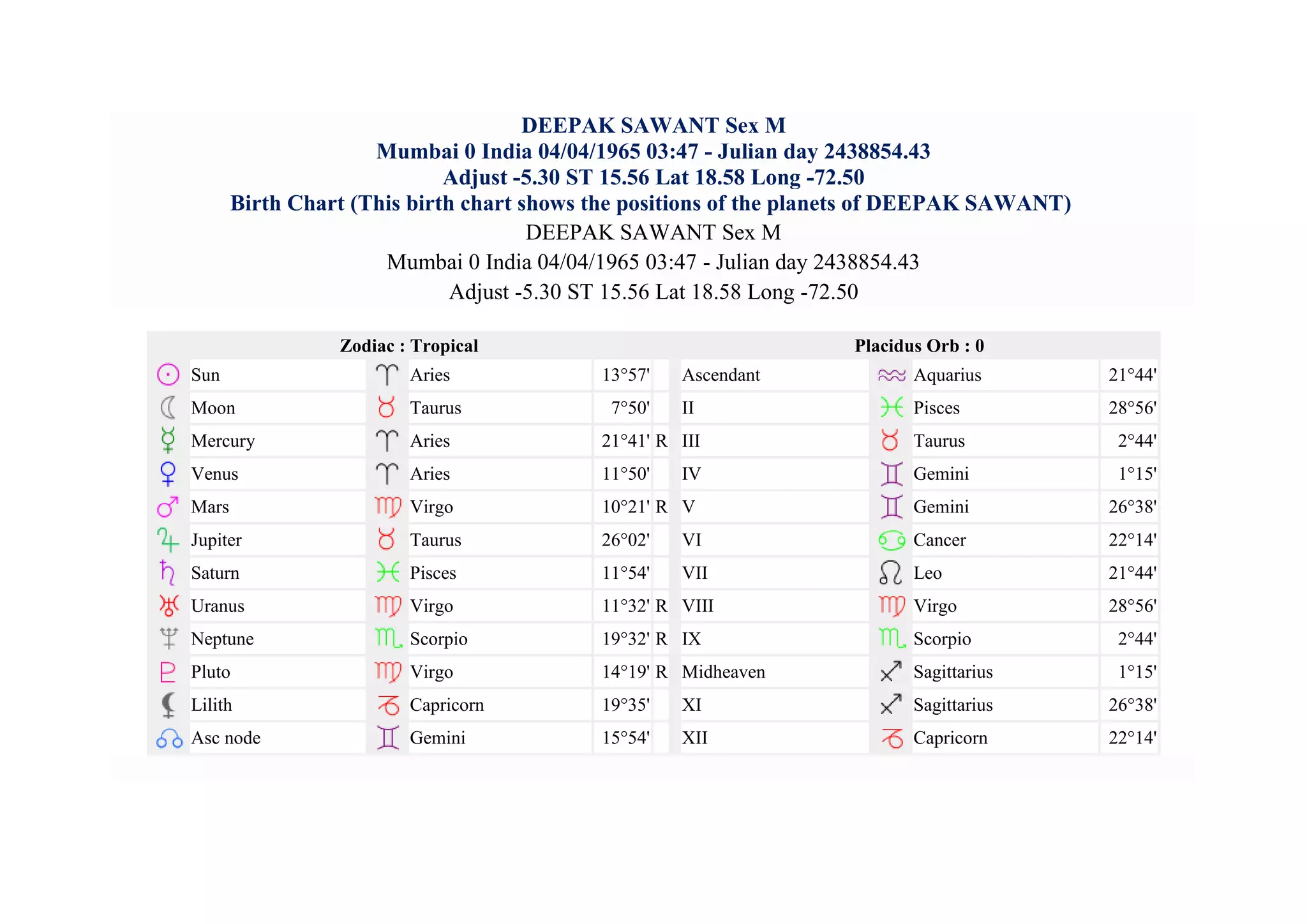 This document contains Deepak Sawant's birth chart and astrological analysis. It provides his birth details, including date, time, and location of birth. It then shows the positions of planets in the signs of the zodiac and houses at the time of his birth. The rest of the document analyzes and describes the influences and tendencies associated with each planet's house position and aspects to other planets based on the rules of astrology.