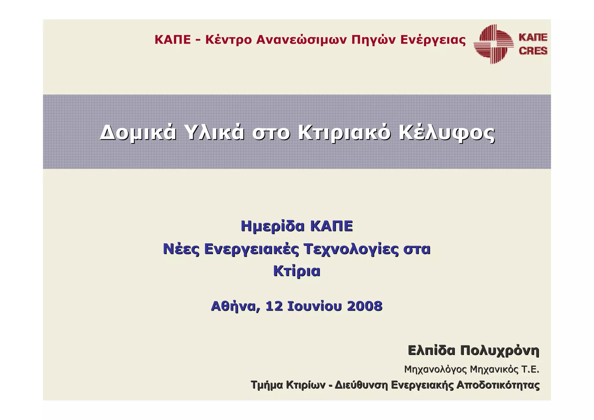 Ημερίδα ΚΑΠΕ: «Νέες Ενεργειακές Τεχνολογίες στα Κτίρια» Αθήνα, 12.06.08