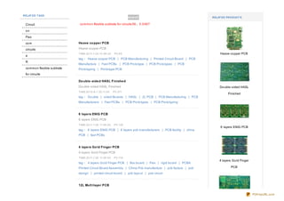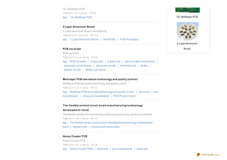 This document contains tags and summaries for various topics related to printed circuit boards (PCBs) including PCB manufacturing technologies, materials, board types, and suppliers. Specific tags include multilayer PCBs, flexible circuits, heavy copper boards, gold finger boards, and LED PCBS among many others. The document provides brief summaries and related search terms for each topic.