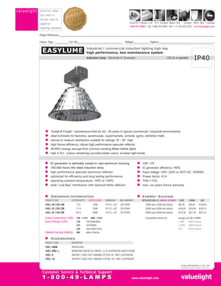 This document summarizes an industrial/commercial induction lighting high bay fixture called EasyLume. It is a maintenance-free system for 20-25 years that provides high performance lighting with low energy consumption. The fixture uses an induction lamp and electronic IC generator that produces over 75 CRI at efficiencies over 90% while saving 40-60% on energy costs compared to metal halide lights. It is suitable for ceilings from 18-40 feet high and has a rated life of 100,000 hours.