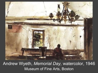 This document provides information on numerous artworks by American artists Andrew Wyeth and N.C. Wyeth across various mediums such as watercolor, tempera, and drybrush. It includes the titles, dates, mediums, and locations of over 50 of their pieces spanning from 1903 to 2002. Many of the works depict rural landscapes and scenes from the artists' lives in Chadds Ford, Pennsylvania, including recurring subjects like the Kuerner family farm. A few comparative works by other artists such as Hopper, Freud, Kline, and Rothko are also mentioned.