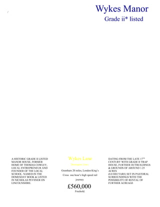Wykes Manor is a historic Grade II* listed manor house dating back to 1680, set in 1.25 acres of secluded rural Lincolnshire countryside. It features numerous original architectural elements and offers multiple reception rooms, bedrooms, and extensive outbuildings. The property is approximately 20 miles from Grantham and benefits from good transport links to London and surrounding market towns.