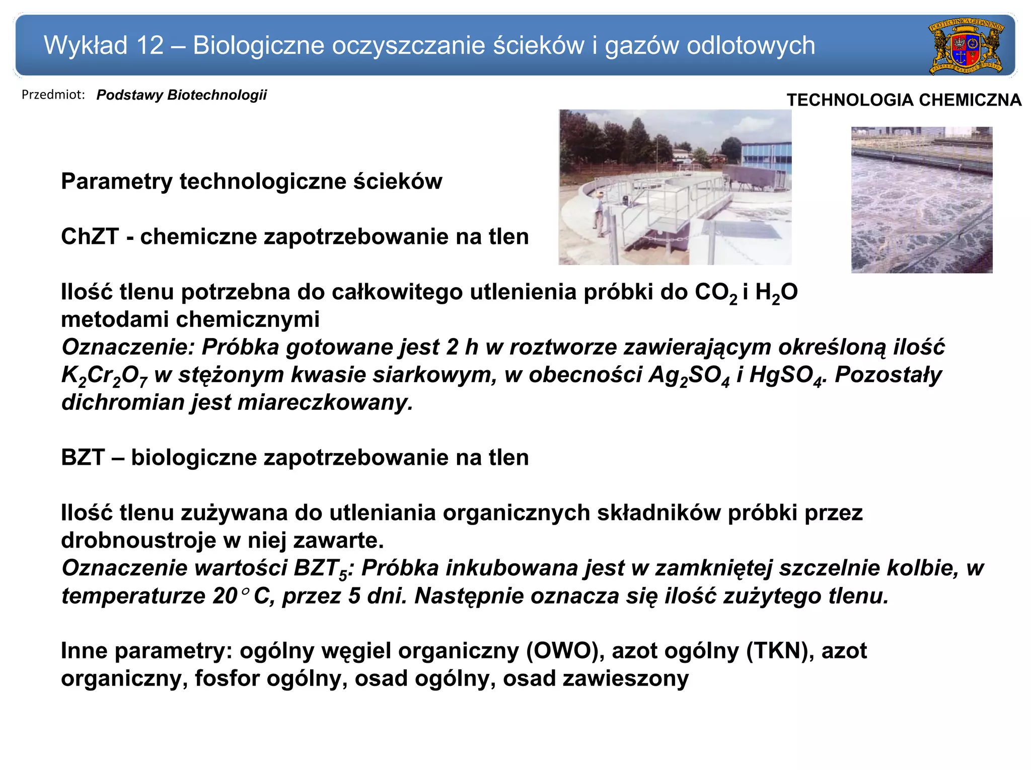 Wykład 12 –Biologiczne oczyszczanie ścieków i gazów odlotowych