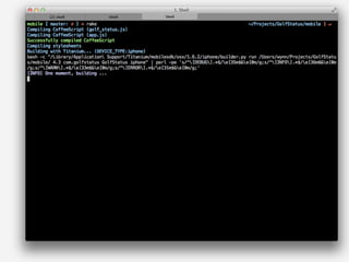 This document discusses using CoffeeScript, Compass, and Sass to accelerate Titanium development. It provides examples of CoffeeScript code and how it improves readability over JavaScript. It also discusses using Sass and Compass for styling Titanium applications, including features like nesting, mixins, variables, and color functions that allow for cleaner, more reusable CSS code. Organizing stylesheets with partials and importing them is also covered.