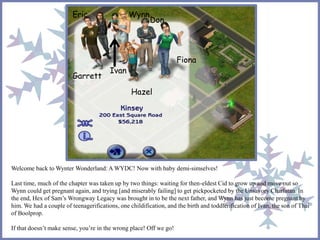 Wynn has just given birth to her eleventh child, Jace, fathered by Hex of Sam's Wrongway Legacy. Jace shows signs of inheriting his father's pointed ears. Ella, Fiona's alien ancestor, pays a visit to meet the new baby. Garrett and Hazel both express interest in applying for scholarships to further their education.