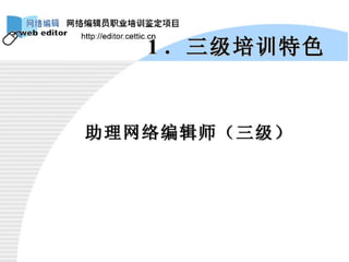 文档阐述了三级和四级网络编辑员的培训与考试方案,包含了远程和面授培训模式、学习资源包及实训课程等内容。三级培训课程重点在技能实训和基础、专业知识学习,而四级培训则强调技术工具的应用和职业标准的实训。此外,网络培训平台提供在线答疑、考前辅导及学习档案管理等辅助功能。