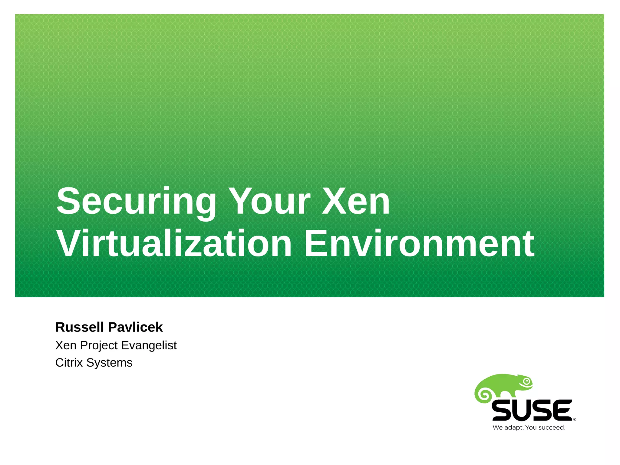 This document provides an overview of securing a Xen virtualization environment. It begins with introducing Russell Pavlicek, a Xen Project Evangelist from Citrix Systems. It then discusses some key security features of Xen like driver domains, stub domains, PVgrub, and the FLASK security module. It examines potential attack surfaces like the network interface, PyGrub bootloader, Qemu device model, and the Xen hypervisor itself. It explains how the security features can be used to mitigate attacks and limit the impact of potential exploits. The document provides basic instructions on configuring some of these security features.