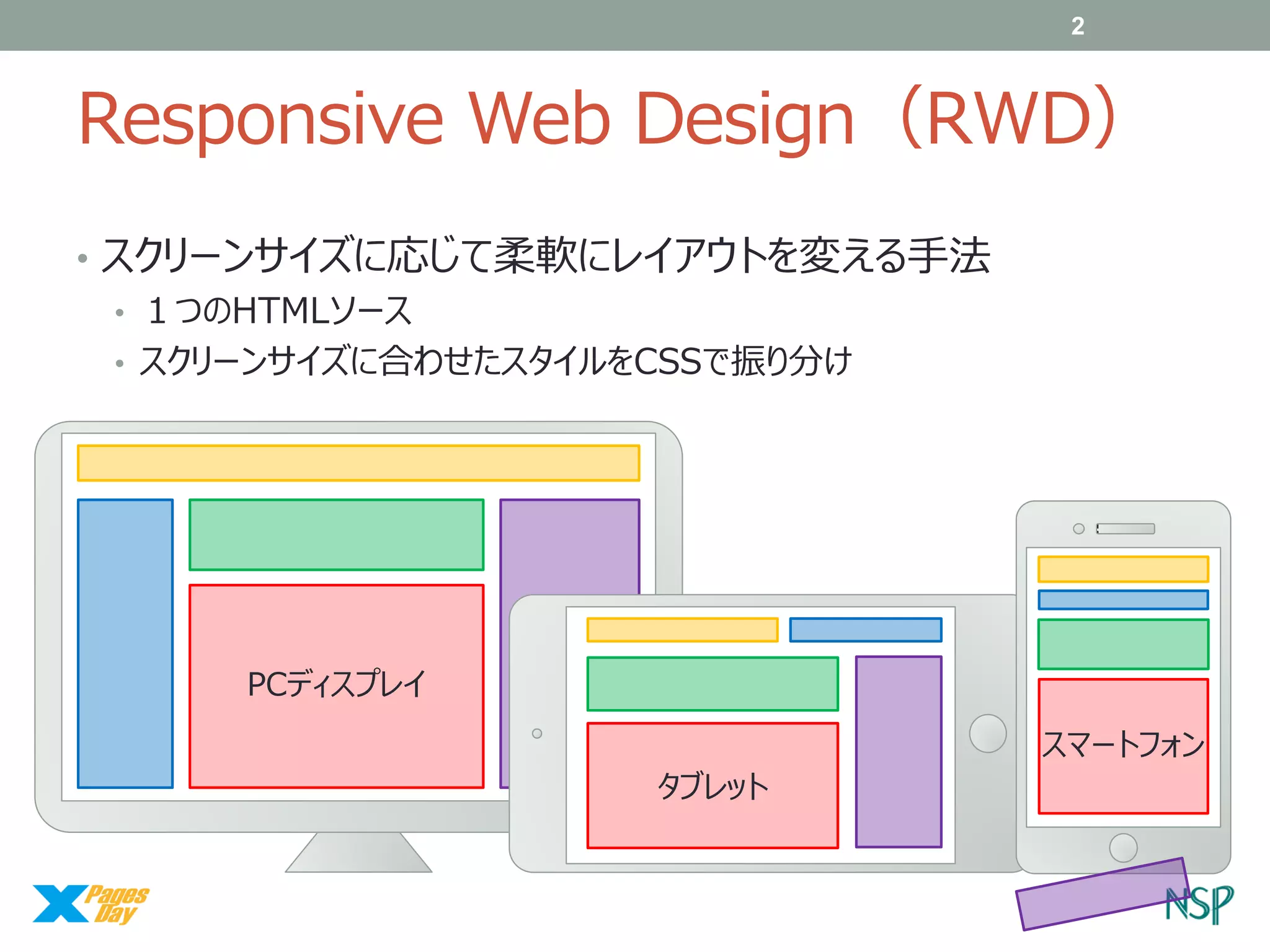 スクリーンサイズに応じて柔軟にレイアウトを変える手法 • 1つのHTMLソース • スクリーンサイズに合わせたスタイルをCSSで振り分け PCディスプレイ スマートフォン タブレット