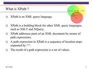 This document provides an overview of XPath, the XML query language. It defines key XPath terminology like nodes, axes, and path expressions. It explains how to navigate an XML document and select elements using absolute and relative paths with slashes. It also covers wildcards, brackets, and functions for selecting elements based on attributes, position, name length, and ancestry. Examples are included to demonstrate different XPath expressions.
