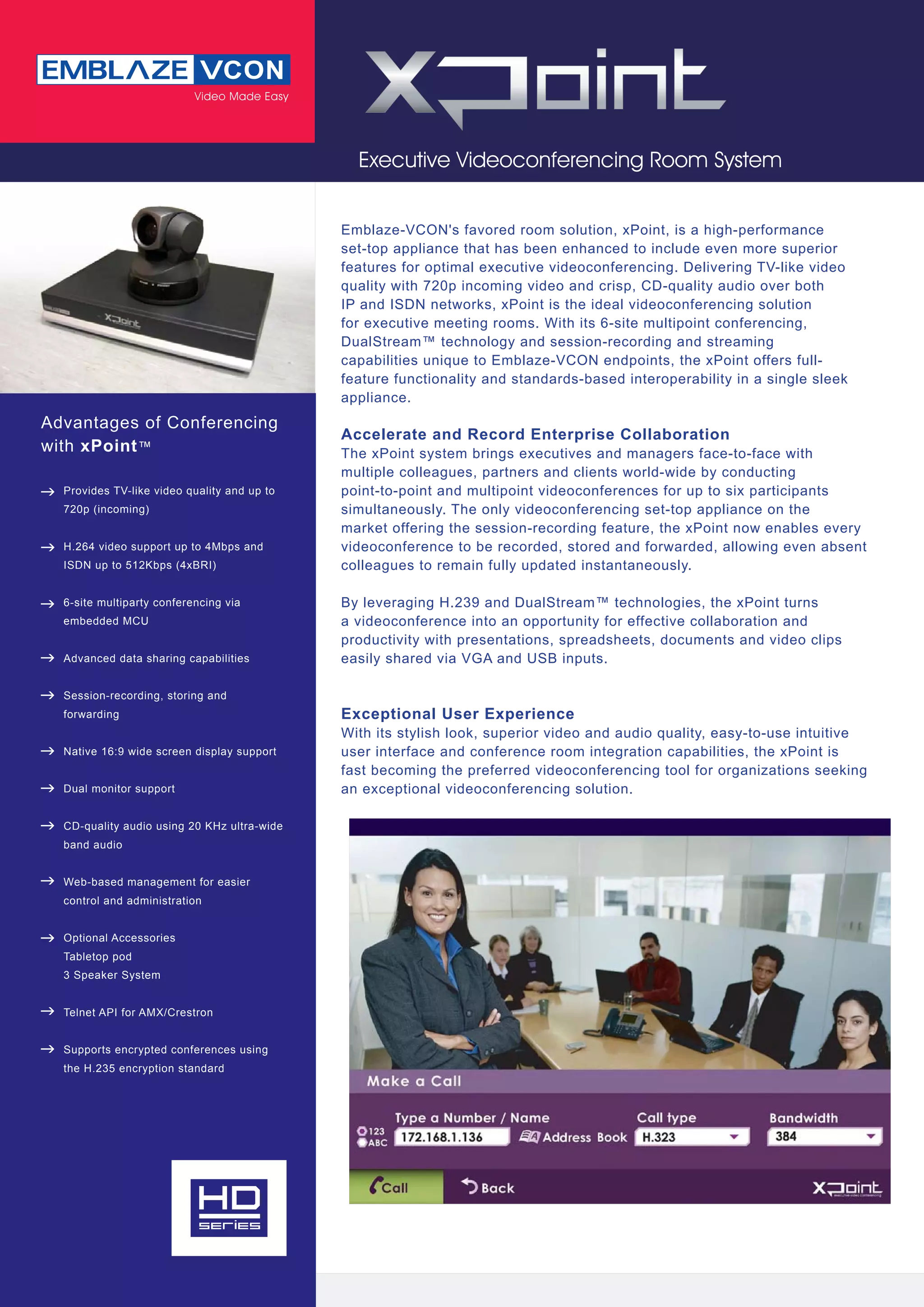 The document describes the Emblaze-VCON xPoint executive videoconferencing room system. The xPoint provides TV-like video quality with 720p video and CD quality audio over IP and ISDN networks. It supports 6-site multipoint conferencing and session recording/streaming capabilities. The xPoint offers full functionality and standards-based interoperability in a single appliance.