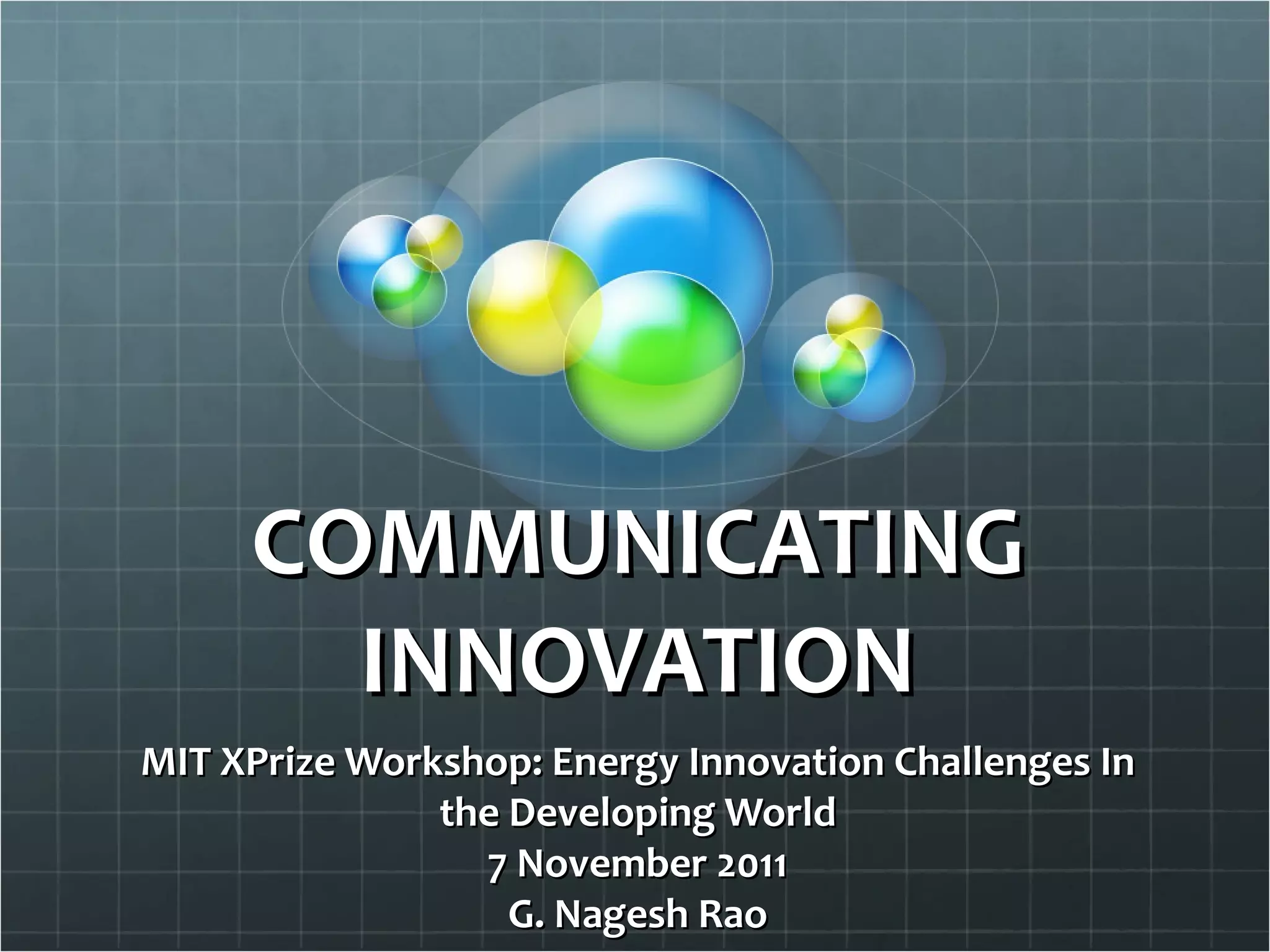 The document provides background on G. Nagesh Rao and summarizes his presentation on communicating innovation at an MIT workshop. It discusses the US government's interest in using prizes to spur innovation and entrepreneurship. It then provides examples of current federal programs that incentivize green technology development through competitive prizes and funding, including the i6 Green Challenge that awards funds for innovative regional projects in renewable energy, energy efficiency, manufacturing and other areas.