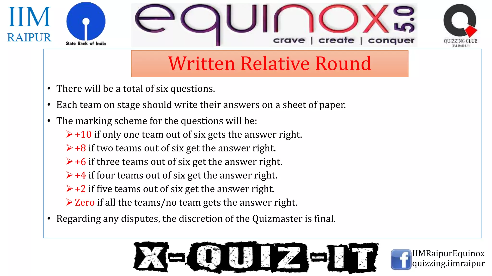 The document outlines the rules for a quiz competition between 6 teams. It states there will be 6 questions that teams must write their answers for on paper. The scoring scheme awards more points the fewer teams that correctly answer each question, with a maximum of 10 points for a single correct team. The quizmaster's decision on any disputes is final. It then provides 6 questions related to brands, companies, and products for the teams to answer.