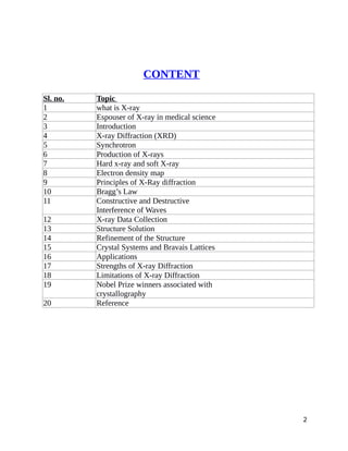 X-ray crystallography is a technique used to determine the three-dimensional atomic structure of crystals. X-rays are diffracted by the crystal and the diffraction pattern is collected on a detector. By analyzing the diffraction pattern using Bragg's law and Fourier transforms, scientists can construct electron density maps and refine protein structures at high resolution. Key aspects of X-ray crystallography include generating X-rays, collecting diffraction data, solving protein structures, and refining models using computational methods. This technique has provided atomic level insights into protein structure and been instrumental in numerous scientific discoveries through applications like determining unknown material structures.