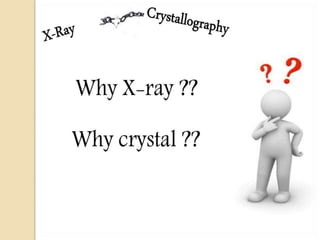 X-ray crystallography is a technique used to determine atomic and molecular structures by analyzing the diffraction patterns of X-rays scattered by a crystallized sample. The principle relies on Bragg's law, which defines the conditions for constructive interference of X-rays reflected from the periodic atomic planes in a crystal. Applications include structural analysis of materials, identification of phases in crystalline materials, and studying biological structures such as proteins and nucleic acids.