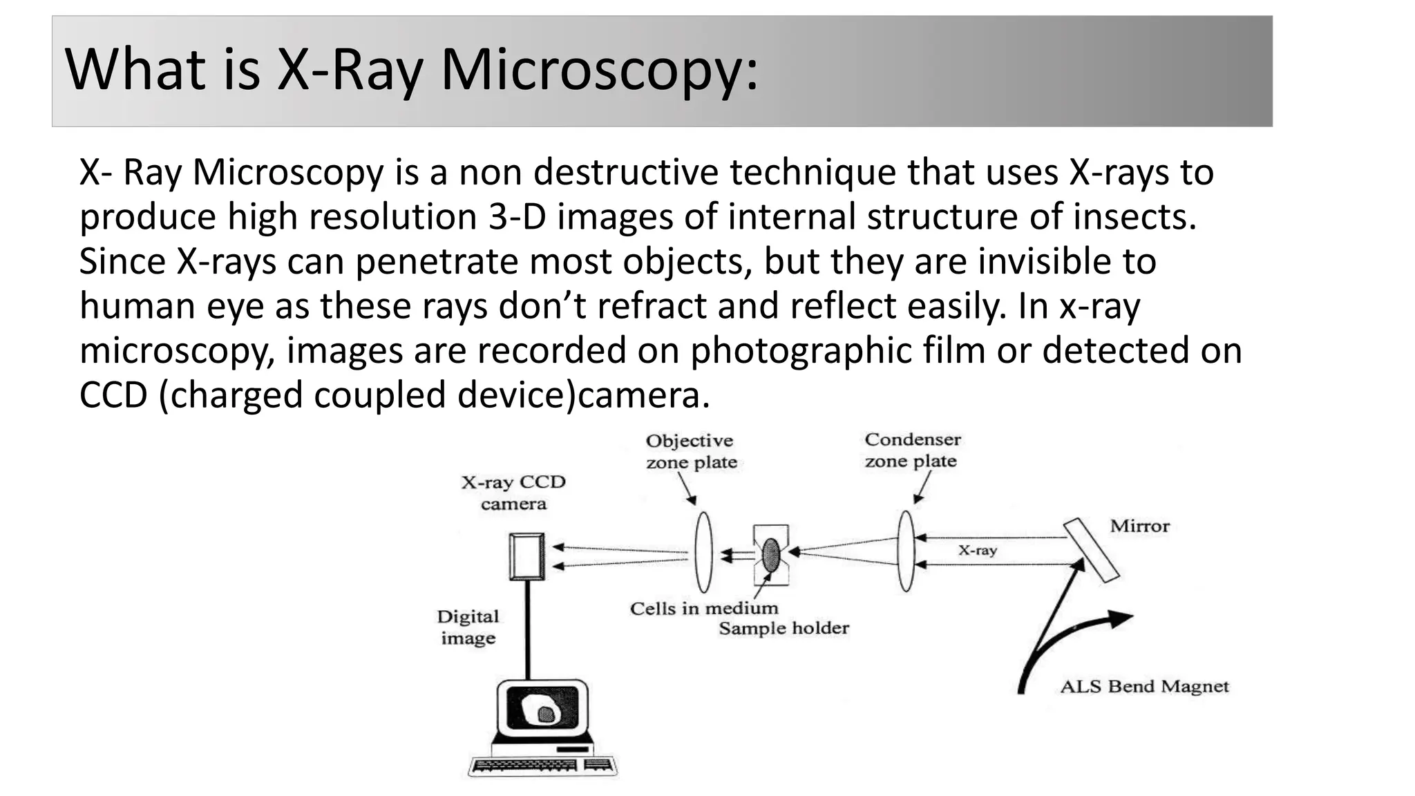 X-ray microscopy is a non-destructive technique used to create high-resolution 3D images of insect structures through the use of x-rays. This study evaluates the efficiency of soft x-ray imaging in detecting infestations in wheat kernels by various insect species, achieving over 96% accuracy in identifying different stages of pests. The findings suggest that soft x-ray methods can effectively identify pest infestations in grain samples more accurately than traditional visual inspection techniques.