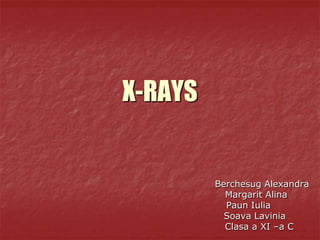 X-rays are electromagnetic waves with wavelengths comparable to the size of atoms that are generated when high-speed electrons collide with a metal target in an X-ray tube. X-rays can penetrate materials like human tissue and be detected using devices like gas detectors, proportional counters, and photodetectors. Digital detectors used in medical imaging can detect X-rays and create images of internal structures. X-rays have various medical applications including diagnostic radiography, fluoroscopy, and radiation therapy due to their ability to pass through matter and ionize materials.