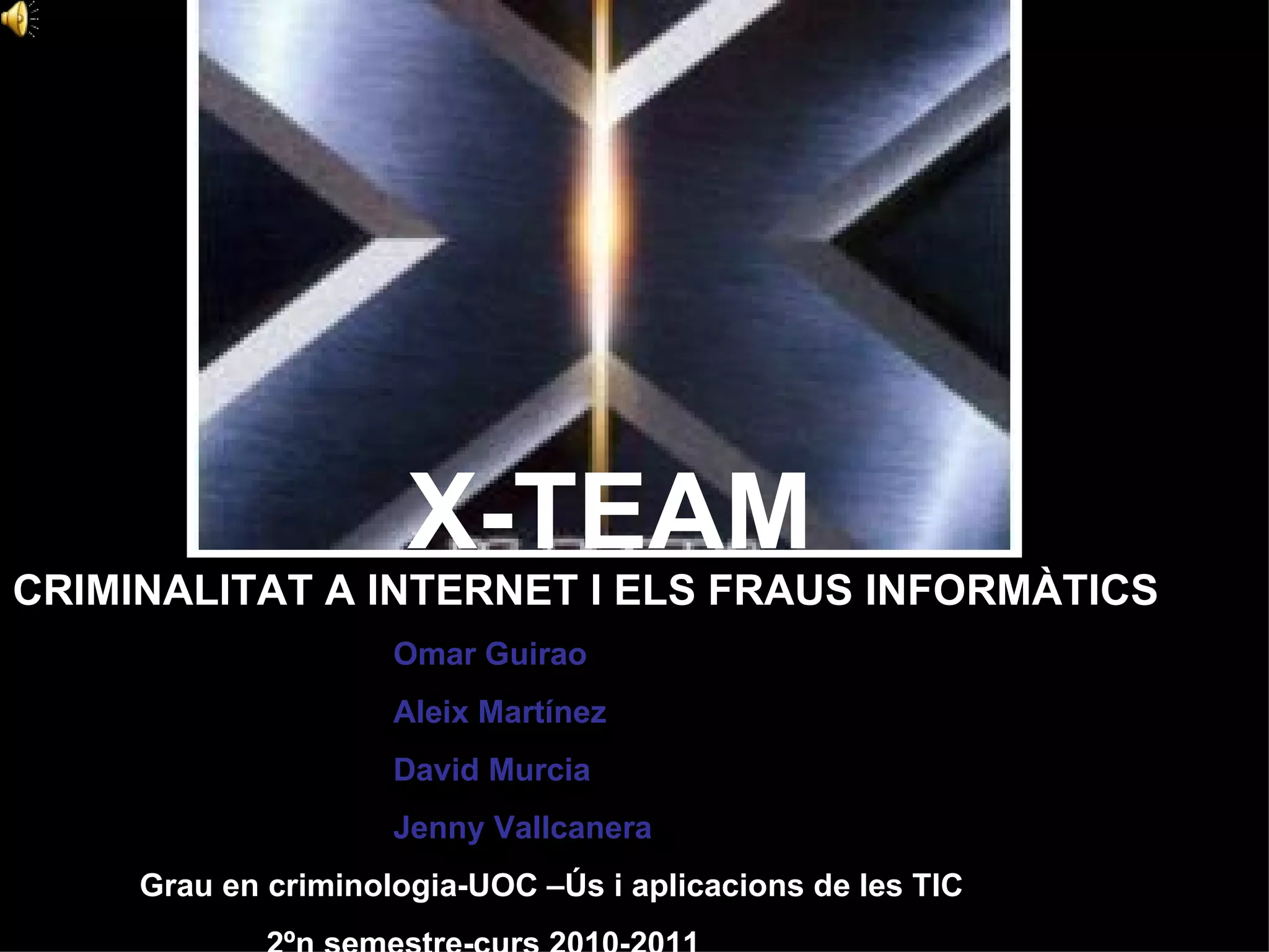 X-TEAM CRIMINALITAT AINTERNET I ELS FRAUS INFORMÀTICS Omar Guirao Aleix Martínez David Murcia Jenny Vallcanera Grau en criminologia-UOC –Ús i aplicacions de les TIC 2ºn semestre-curs 2010-2011