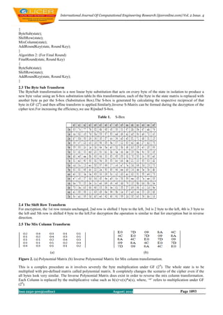 The document summarizes a research paper that proposes a new symmetric block cipher algorithm similar to AES but with a 200-bit block size instead of 128 bits. It compares the power consumption and strict avalanche criteria of the proposed algorithm to other AES standards. The power consumption during encryption is up to 30% lower but decryption is 20% higher. The strict avalanche criteria shows the proposed algorithm meets security levels of AES. The algorithm is described in detail including key schedule, byte substitution, shift row, mix column, and add round key transformations.