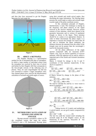 This document discusses the measurement of zenith and azimuth angles for a 2D Doppler skymap plot, implemented using LabVIEW, for an ionosonde system designed to study the ionosphere. It highlights the process of capturing echoes from the ionosphere to analyze electron density variations and the importance of azimuth and zenith angles in calculating the drift velocity of the ionospheric layer. The implementation has been validated against commercially available ionosonde systems, showing promising results that align with established data.
