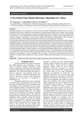The document presents a novel real-time motion detection algorithm that addresses the challenges of existing methods in dynamic backgrounds. It integrates temporal differencing, optical flow, double background filtering, and morphological processing for enhanced accuracy without requiring a static background model. The proposed system aims to improve the efficiency of video surveillance applications by eliminating background interference and adapting to rapid environmental changes.