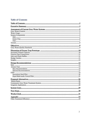 The document provides design recommendations for improving grey water systems in San Miguel Suchixtepec, Mexico. It summarizes that the original systems installed in 38 homes are not being properly maintained, with only 8-10 still functioning after a year. The recommendations aim to create a more robust and easily maintained system using local materials. Key recommendations include: