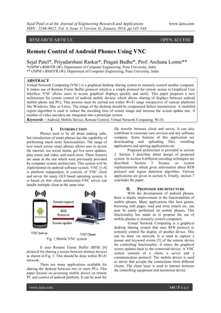The paper presents a new architecture for remote control of Android devices using Virtual Network Computing (VNC), enabling screen sharing and functionality access between Android phones and PCs over Wi-Fi. It details the design, encoding techniques, and system implementation necessary to facilitate this remote connection, including a modified region detection algorithm to improve screen update rates. Applications of this technology include remote assistance, customer services, and educational tools.
