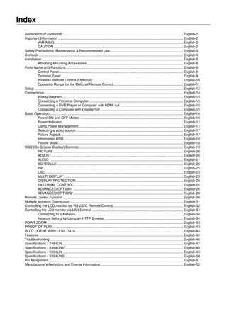 The document is a user's manual for the MultiSync X464UN, X464UNV, X554UN, and X554UNS monitors, providing essential information for installation, operation, maintenance, and safety precautions. It details specifications, setup procedures, connection options, remote control functions, and troubleshooting tips. The manual emphasizes the importance of following safety guidelines and using the appropriate equipment to ensure optimal performance and user safety.