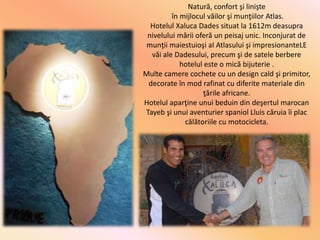 Hotelul Xaluca Dades, situat la 1612m altitudine în munții Atlas, oferă un peisaj unic, fiind înconjurat de văile Dades și satele berbere. Camerele sunt decorate cu materiale rafinate din diferite țări africane, oferind un design cald și primitor. Hotelul este deținut de un beduin marocan și un aventurier spaniol pasionat de călătoriile cu motocicleta.