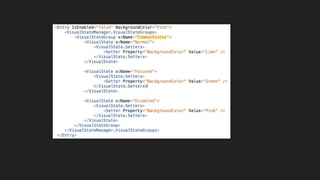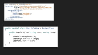 This document provides 15 tips and tricks for using XAML in Xamarin.Forms applications. It begins with introductions to XAML and Xamarin.Forms. It then covers tips such as using string formatting, attached properties, generic styles, native properties, simplifying namespaces, triggers, converters, commands, passing parameters, creating colors, and visual states. Examples are provided before and after demonstrating each tip. References and contact information are provided at the end.