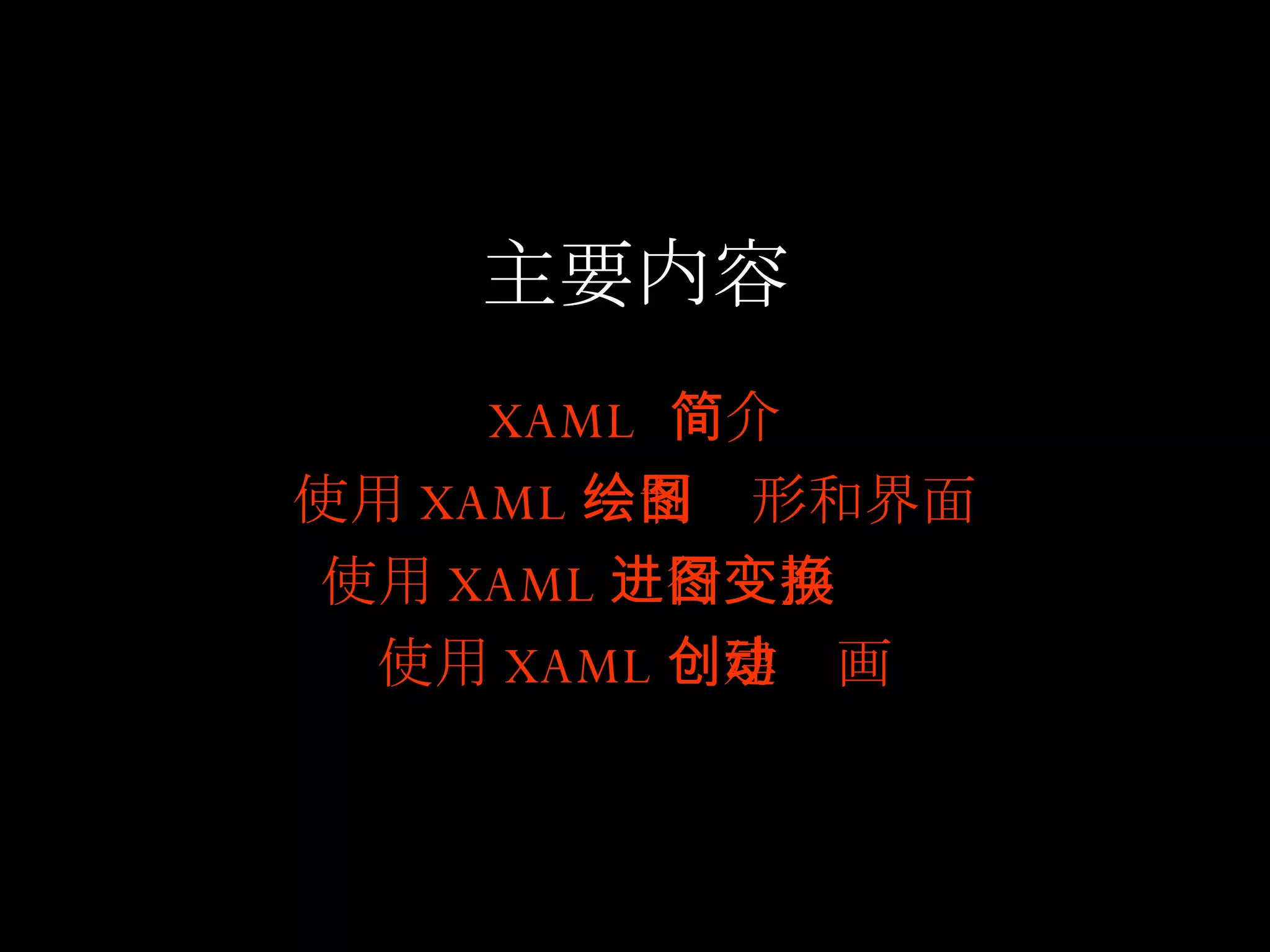 本文件介绍了 XAML(可扩展应用程序标记语言)的基础知识,包括如何使用它绘制图形和界面、进行图形变换和创建动画。文中通过具体示例解释了 XAML 元素的使用,包括画布、图形、笔刷、文本和媒体元素。最后,探讨了通过事件触发器创建动画效果的机制,展示了如何利用 XAML 制作复杂的动画。