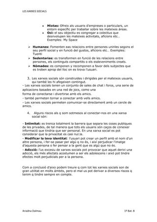 XARXES SOCIALS:<br />Quèsón?<br />Tipus<br />Característiques<br />Riscos<br />3018790127635<br />Una xarxa social és una estructura on es crean relacions entre els membres/usuaris d’una comunitat. Apuesta estructura es pot representar mintjançant un gràfic format per nodes, les persones o grups de persones i uns nexes d’unió, que simbolitza la relació establerta entre els diferents individus. <br />Els objectius d’una xarxa social poden anar desde trovar copanys de colegi fins noves amistat, ralacions de traball, posarse en contacta a llargues distàncies, intercambiar información etc…<br />Hi han dos tipus de xarxes socials que són:<br />XARXES SOCIALS OFF-LINE/ANALÓGIQUES: son xarxes formades per grups de persones amb alguna relació en comú, es portan a terme sense necessitat de aparells o sistemes electrónics.<br />XARXES SOCIALS ON-LINE/DIGITALS: es desenvolupen a traves de sistemes electronics. Hi han molts tipus com per exemple:<br />Horizontals: van dirigides a tot tipus d’usuaris. Permet l’entrada i participación lliure sense niguna fi en concret. Per exemples: facebook, Twitter... <br />Verticales: el seu objectiu es entorn una temática en concret congregar un colectiu en concret. Poden ser: <br />Profesionales: dirigides a crear relacions profesionals entre els seus usuaris. <br />Mixtas: Ofreix als usuaris d’empreses o particulars, un entorn específic per traballar sobre les mateixes áreas.<br />Oci: el seu objectiu es congregar a colectius que desnvolupen les mateixes activitats, aficions etc… Exemples: My Space<br />Humanes: Fomenten eas relacions entre persones uninles segons el seu perfil social y en funció del gustos, aficions etc… Exemples: Tuenti<br />Sedentarias: es transformen en funció de les relacions entre persones, els continguts compartits o els esdeveniments creats. <br />Nómades: es componen y recomponen a favor dels subjectes que es troben aprop del lloc on es trova l’usuari.<br />Les xarxes socials són construides i dirigides per el mateixos usuaris, qui també les hi afegeixen contingut. <br />- Les xarxes socials tenen un conjunto de sales de chat i foros, una serie de <br />aplicacions basades en una red de jocs, como una <br />forma de conectarse i divertirse amb els amics. <br />- també permeten tornar a conectar amb vells amics.<br />- Les xarxes socials permeten comunicar-se directament amb un cercle de amics. <br /> Alguns riscos als q som sotmesos al conectar-nos en una xarxa social són:<br /> <br />- Intimitat: es trenca totalment la barrera que separa les coses publiques de les privades, de tal manera que tots els usuaris són caços de coneixer informació que tindria que ser personal. En una xarxa social es pot considerar que la privacitat es casi nul.la.<br />- Modificar la teva identitat: l’usuari pot crear un perfil amb el nom d’un altre persona, i fer-se pasar per algú q no és, i així perjudicar l’imatge d’aquesta persona o fer pensar a la gent que es algú que no és. <br />- Adicció: l’us excesiu de xarxes socials pot provocar que aquet derivi una adicció, els més afectats acostumen a ser els adolescens i aixó pot tindre efectes molt perjudicials per a la persona.<br />Com a conclusió d’aixo podem treure q com tot les xarxes socials son de gran utilitat en molts ámbits, pero el mal us pot derivar a diversos riscos q tenim q tindre sempre en compte.<br /> <br /> <br />