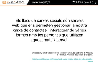 2Els llocs dexarxes socials són serveis web que ens permeten gestionar la nostra xarxa de contactes i interactuar de vàries formes amb les persones que utilitzen aquest mateix servei.Web social y salud: Sitios de redes sociales y Wikis, del Gobierno de Aragón y de l’ Instituto Aragonés de Gestión de la Salud.http://www.slideshare.net/imugua/web-social-y-salud-sitios-de-redes-sociales-y-wikis