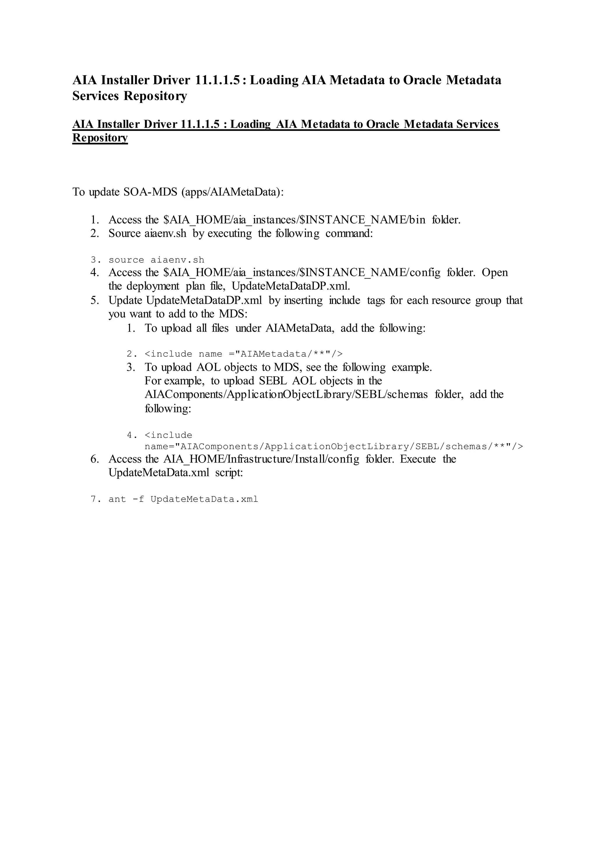 The document provides instructions for loading AIA metadata into the Oracle Metadata Services Repository using AIA Installer Driver 11.1.1.5. It involves updating the deployment plan file UpdateMetaDataDP.xml to include tags for the metadata resources to upload, then executing the UpdateMetaData.xml script to load the metadata.