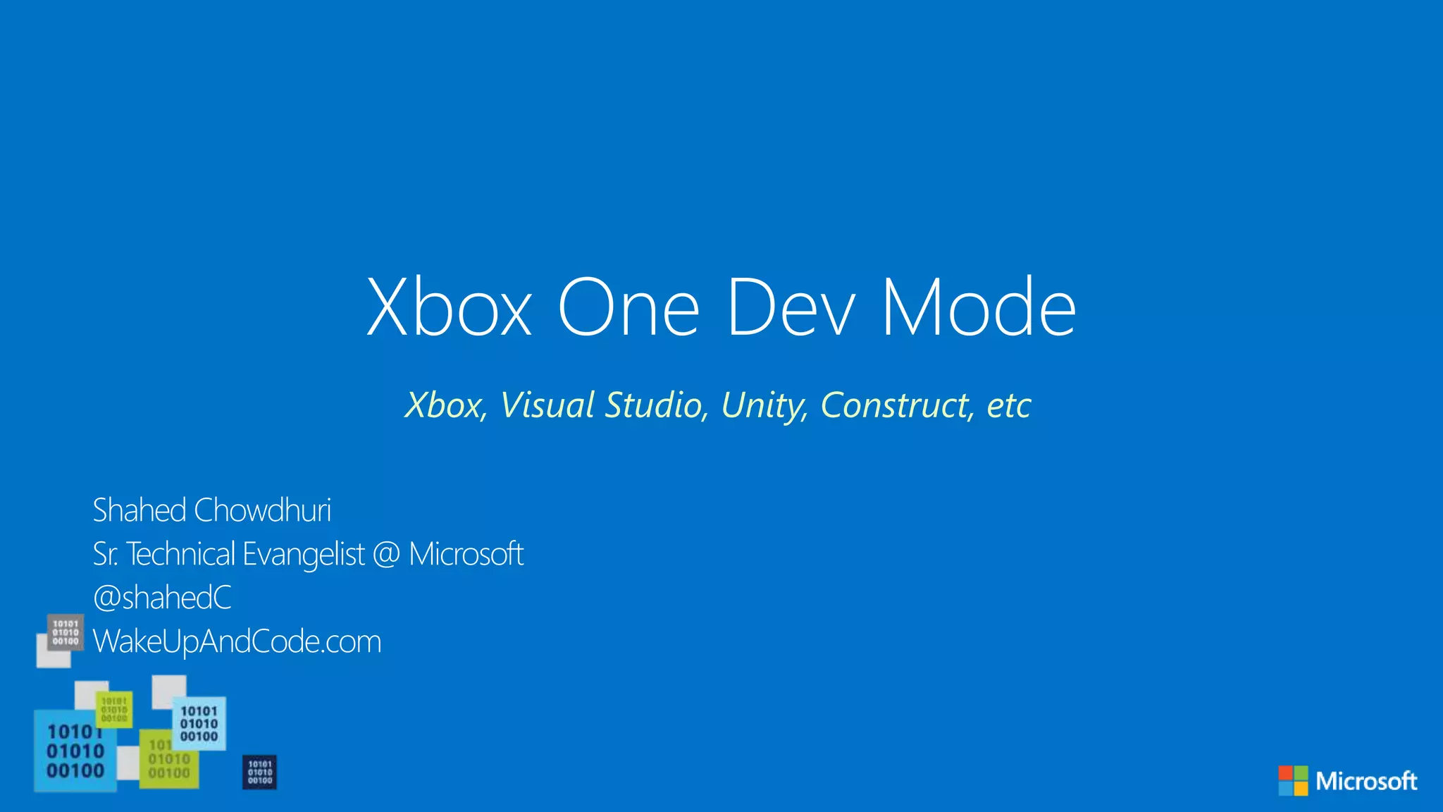 This document outlines various resources and tools for developing games on the Xbox One platform, including activation of developer mode, UWP support, and Visual Studio integrations. It highlights the Xbox Live Creators Program, community building features like clubs and game hubs, and offers links for further information and setup. Additionally, it introduces key personnel, such as Shahed Chowdhuri and Stacey Haffner, involved in Xbox development initiatives.