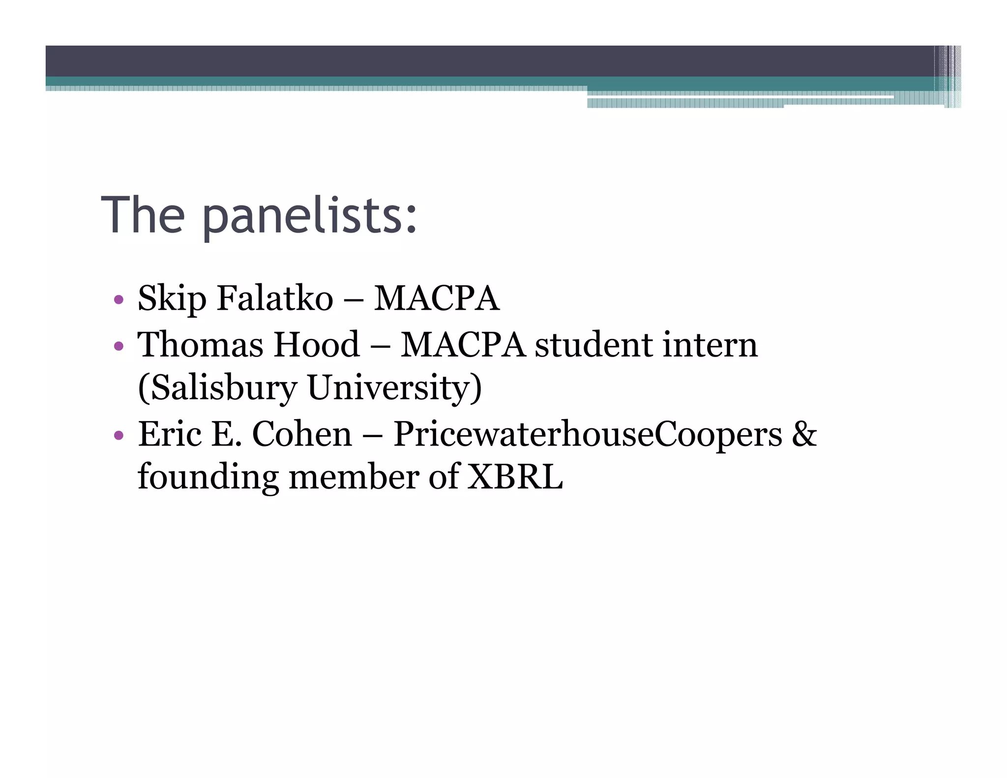 The document discusses XBRL (Extensible Business Reporting Language), an open standard for tagging financial information that facilitates data exchange and compliance, particularly for CPAs and organizations like MACPA. It details the importance of taxonomies for organizing data, challenges in implementation, and how XBRL can improve efficiency in financial reporting and auditing. The document also highlights ongoing XBRL initiatives and resources available for professionals interested in this technology.