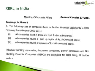 The document provides information about a 1-day training programme on eXtensible Business Reporting Language (XBRL). XBRL is a global standard for electronic communication of business and financial reports that allows for automation and analysis of financial data. The training will enable participants to file financial statements in XBRL format using a software tool. It will cover the background, taxonomy, and hands-on practice of converting financial reports into XBRL, as well as the filing process on the MCA21 portal. The fee for the full training is INR 35,000, or INR 2,000 for half-day practical training.