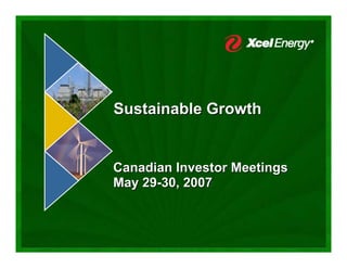 This document summarizes information from a presentation given by Xcel Energy to Canadian investors. It outlines Xcel Energy's strategy of focusing on fully regulated utility operations, highlights their leadership in renewable energy and environmental initiatives, and provides projections showing expected sustainable earnings growth through 2020 driven by continued capital investments. Regulatory mechanisms across their jurisdictions allow for recovery of fuel and purchased power costs as well as major capital investments.