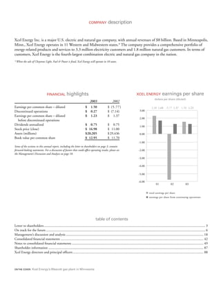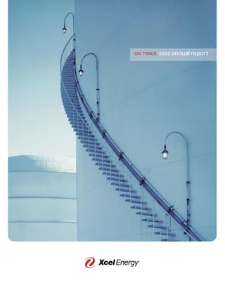 This document is Xcel Energy's 2003 annual report. It provides the following key information: 1) Xcel Energy is a major electric and natural gas utility serving 3.3 million electricity customers and 1.8 million natural gas customers across 11 Western and Midwestern states. 2) In 2003, Xcel Energy met its earnings target of $1.23 per share from continuing operations, despite challenges including higher costs and less favorable weather. Total earnings were $1.50 per share. 3) Key priorities and accomplishments in 2003 included refinancing debt at lower rates, divesting from NRG Energy, and operational successes like generating and safety records at several plants.