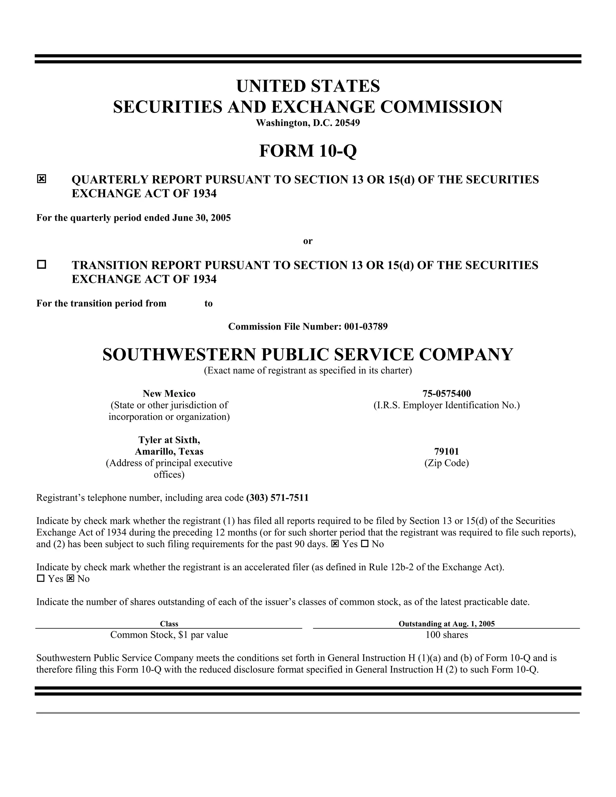 This document is a Form 10-Q quarterly report filed by Southwestern Public Service Company (SPS) with the Securities and Exchange Commission for the quarter ended June 30, 2005. SPS is a wholly owned subsidiary of Xcel Energy Inc. The report provides SPS's unaudited financial statements and notes for the quarter, including its consolidated statements of income, cash flows, and balance sheets. It also discusses SPS meeting the conditions to file a reduced disclosure format 10-Q and provides an overview of SPS's regulatory environment and market-based rate authority with the Federal Energy Regulatory Commission.