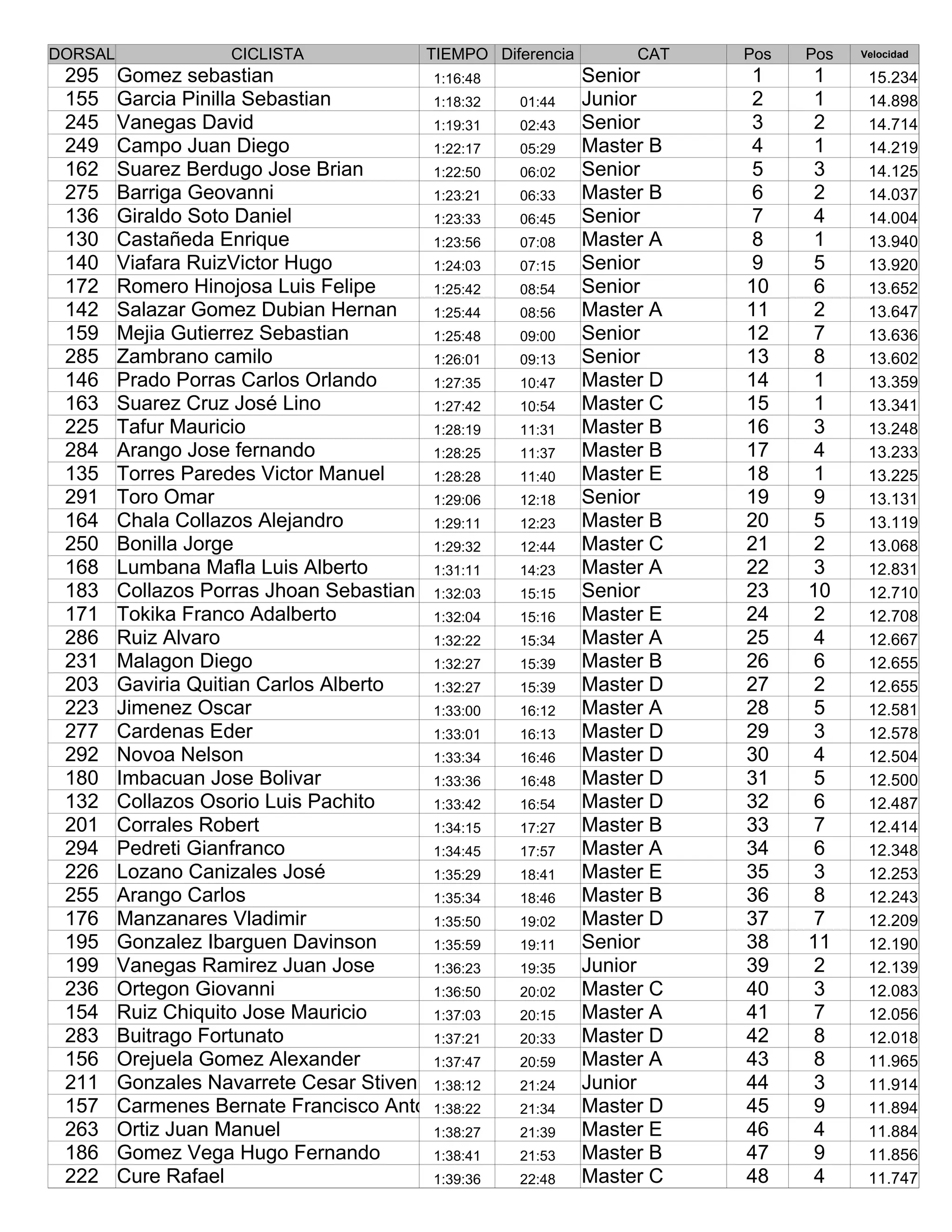 - The cyclists finishing near the top in their respective categories included Juan Diego Campo, Geovanni Barriga, and Alejandro Chala Collazos.