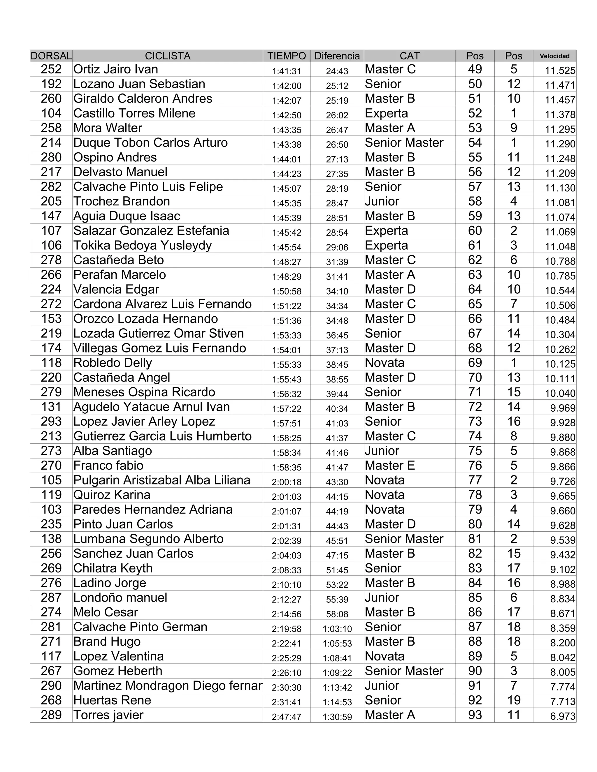 This document contains results from a cycling competition including 93 participants across various age categories. It lists each cyclist's dorsal number, name, time, time difference from first place, category, position in category, and speed. Key details include: