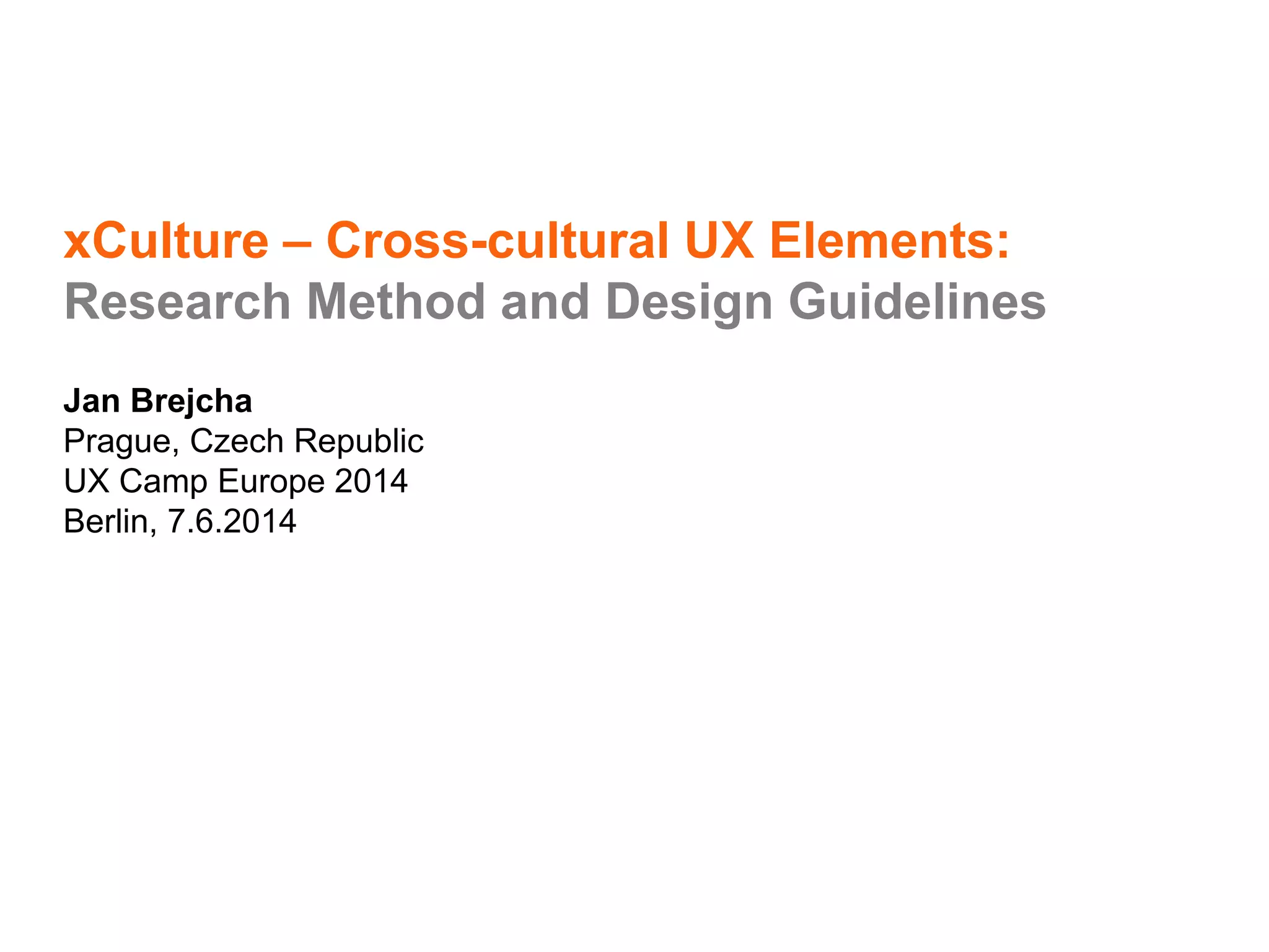 This document discusses research conducted on cross-cultural UI design preferences between Chinese and Czech users, emphasizing the importance of tailoring UI elements to specific cultural contexts for better user acceptance. The research involved interviews, semiotic analysis, and identification of design guidelines based on user preferences for color, layout, symbols, and interaction structures. Key findings highlight both global influences and significant cultural differences that should be considered in UI design to enhance usability and aesthetic appeal.