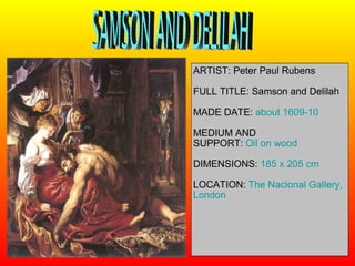 The document provides background information on Peter Paul Rubens' painting "Samson and Delilah" from about 1609-1610. It identifies the location of the oil on wood painting at The National Gallery in London and lists some key elements in the scene including soldiers at the door, an old woman, a long chair, and Samson sleeping. The passage also gives brief biographical details on Rubens and his travels to Italy in 1600 where he was influenced by Italian masters in Venice and Mantua.