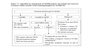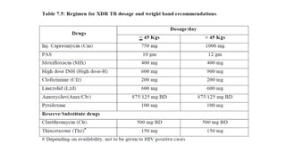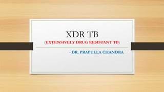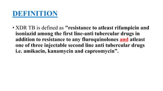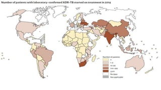 This document discusses extensively drug resistant tuberculosis (XDR TB). It defines XDR TB as resistance to at least rifampin and isoniazid among first-line drugs, plus resistance to any fluoroquinolone and at least one second-line injectable drug. Globally, an estimated 9.7% of MDR TB cases have XDR TB. XDR TB has been reported in 105 countries as of 2014, with the highest rates in several Eastern European and Southern African countries. Treatment of XDR TB requires utilizing the few drugs the infection remains susceptible to in a lengthy 24-30 month regimen.