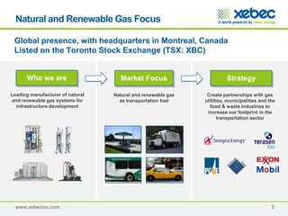 Xebec Inc. is a leading manufacturer of natural gas and renewable gas systems focused on infrastructure development. It provides biogas upgrading plants, hydrogen purification systems, and natural gas dryers. Xebec has a global presence with headquarters in Montreal, Canada and is listed on the Toronto Stock Exchange. It sees opportunities in developing partnerships to increase the use of natural and renewable gases as transportation fuels. Xebec has extensive experience with biogas upgrading projects internationally and sees growing demand for renewable gas in transportation due to blending requirements and economics.