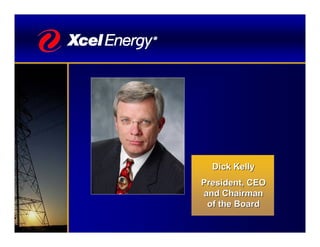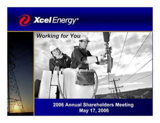 1) Xcel Energy held its 2006 annual shareholders meeting on May 17, 2006. The meeting addressed the election of directors, ratification of auditors, and a proposal to separate the roles of Chairman and CEO. 2) Xcel Energy reported strong financial results for 2005 and the first quarter of 2006, and provided guidance for 2006 earnings. The company is making investments in its core businesses and environmental projects to earn its authorized rate of return. 3) Xcel Energy highlighted its commitment to renewable energy, environmental technologies, energy assistance programs, and involvement in local communities. The company aims to provide long-term value and returns to shareholders.