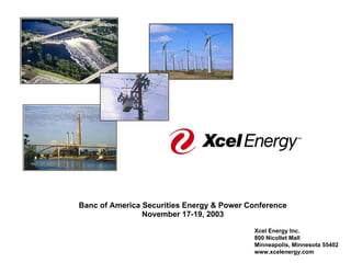 This document provides an overview of Xcel Energy from their presentation at the Banc of America Securities Energy & Power Conference in November 2003. Key points include that Xcel achieved several accomplishments in 2003 including settling with NRG creditors and maintaining investment grade ratings. Objectives for 2004 include investing additional capital in utilities, providing competitive returns to shareholders, and improving credit ratings. Earnings guidance for 2003 is $1.48-$1.53 per share and $1.15-$1.25 per share for 2004.